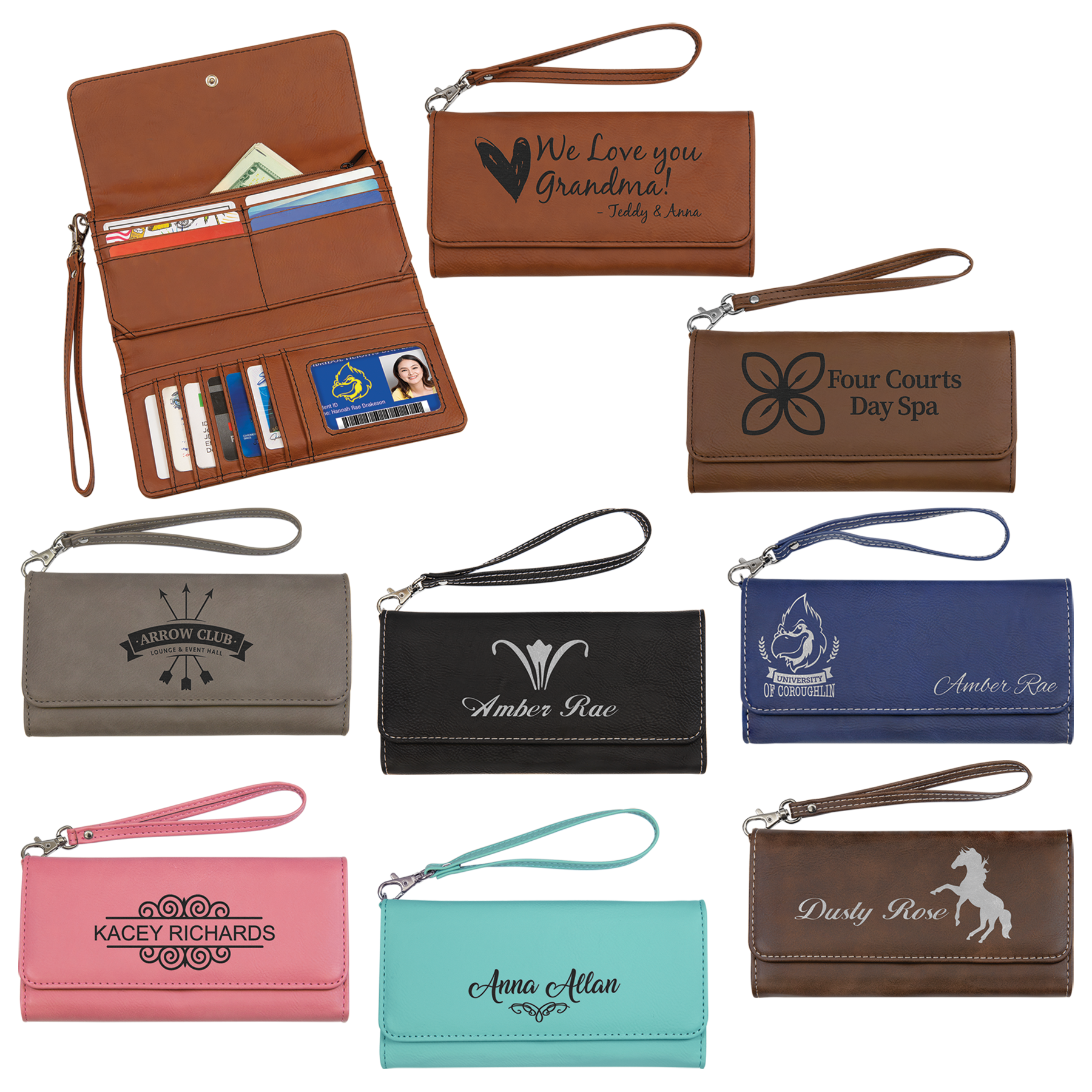 - Includes 12 slots for cards plus and ID, a zipper compartment, 1 large and 2 smaller compartments and a detachable wrist strap.